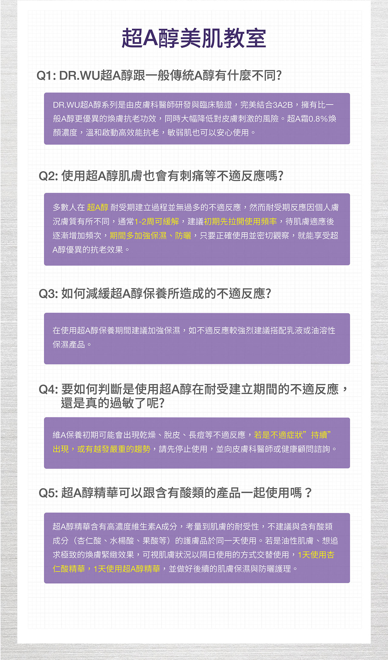 3A2B的配方完美結合A醛+A醇+A酯與B3+B5,高效煥顏抗老,比傳統A醇更安全、更快見效。0.8%超A醇溫和煥顏濃度,一般肌膚可天天使用,不間斷地由肌底激活新生能量。偕同三、四、六胜肽撫平細紋,鹼醯胺B3和植萃舒緩,泛醇B5、玻尿酸、角鯊烷保濕改善粗糙,強化肌膚屏障。同時使用活性滲透包覆科技和雙層真空包裝,封存最鮮活的維A族活性,全面煥活肌膚,讓肌膚年輕。