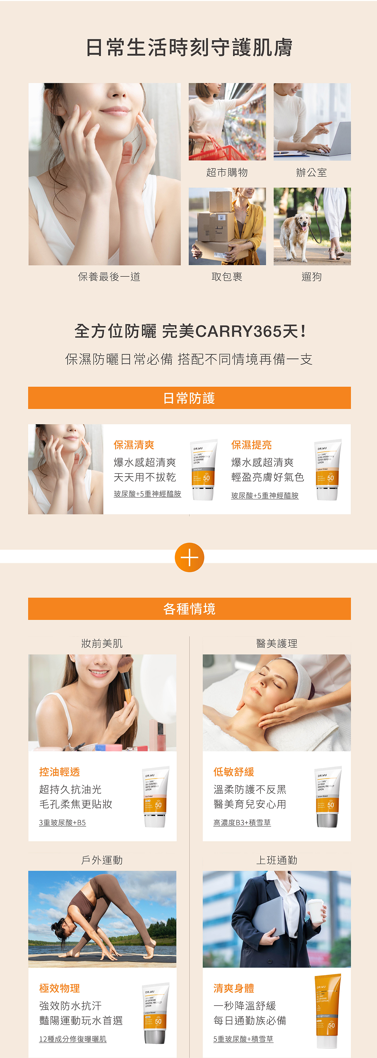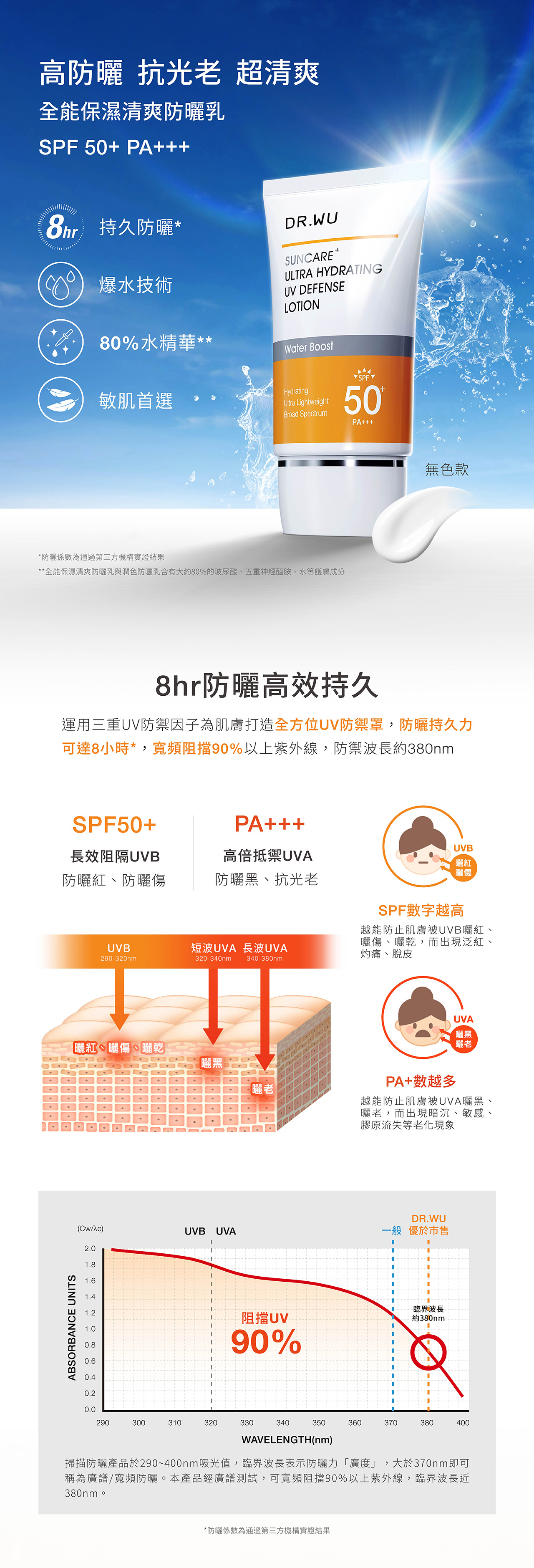 超清爽爆水防曬乳,獨特的輕盈質地,給予肌膚水潤舒適觸感,運用光穩定廣譜防禦機制,長效抵禦紫外線UVA及UVB,預防曬黑及曬老,結合玻尿酸及五重神經醯胺,立即保濕補水,強化肌膚屏障,使肌膚長效持水滋潤,實現外防禦、內修護的全方位防曬效果。