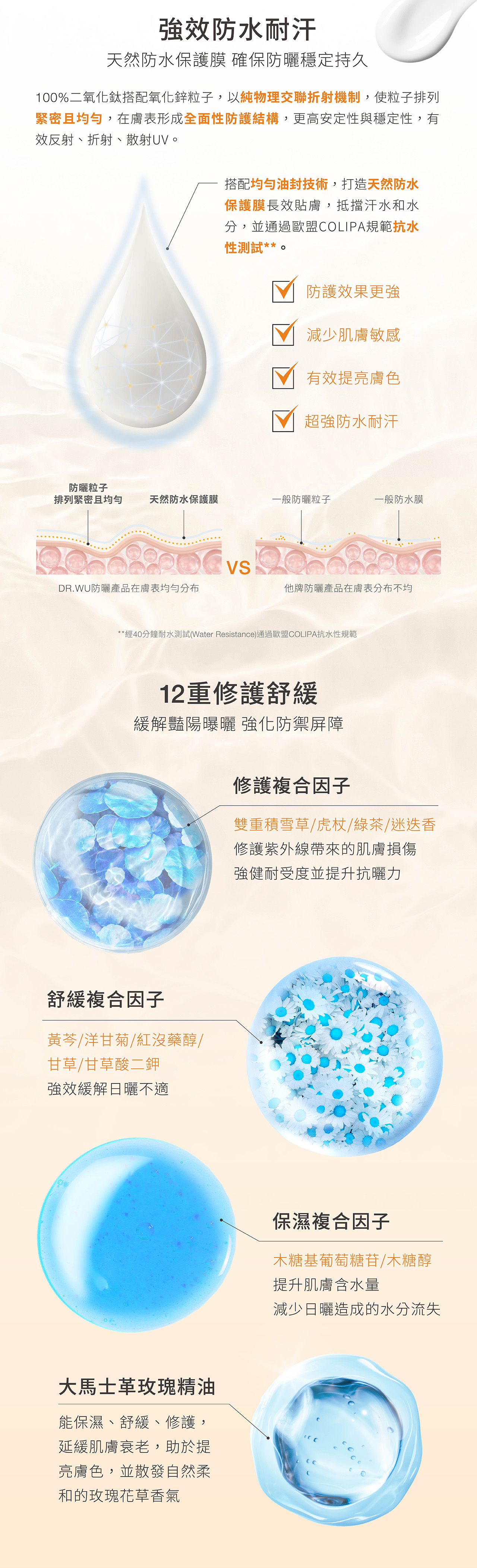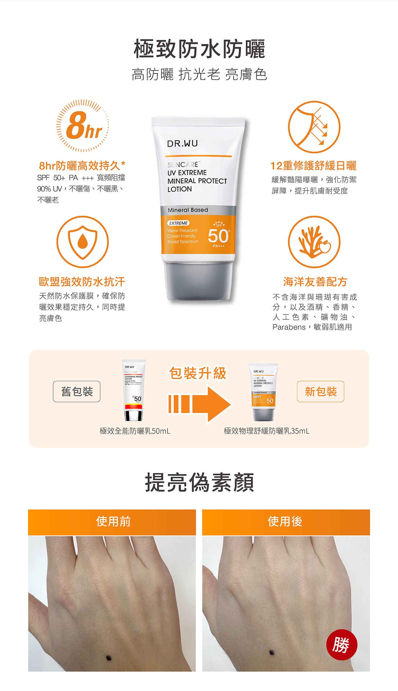 極效物理防曬乳具有優異的防水抗汗功能,採用100%純物理交聯折射機制,有效隔離UVA及UVB,預防曬黑及曬老,添加積雪草、紅沒藥醇等十種植物精萃,保濕修護肌膚,幫助減緩曝曬時的不適,實現外防禦、內修護的全方位防曬效果。純物理性海洋友善配方,不添加傷害珊瑚之防曬及防腐成分,戶外與海邊活動適用。