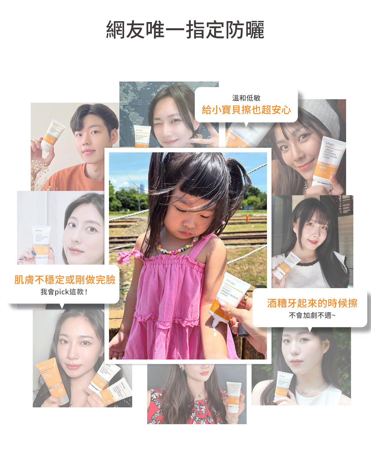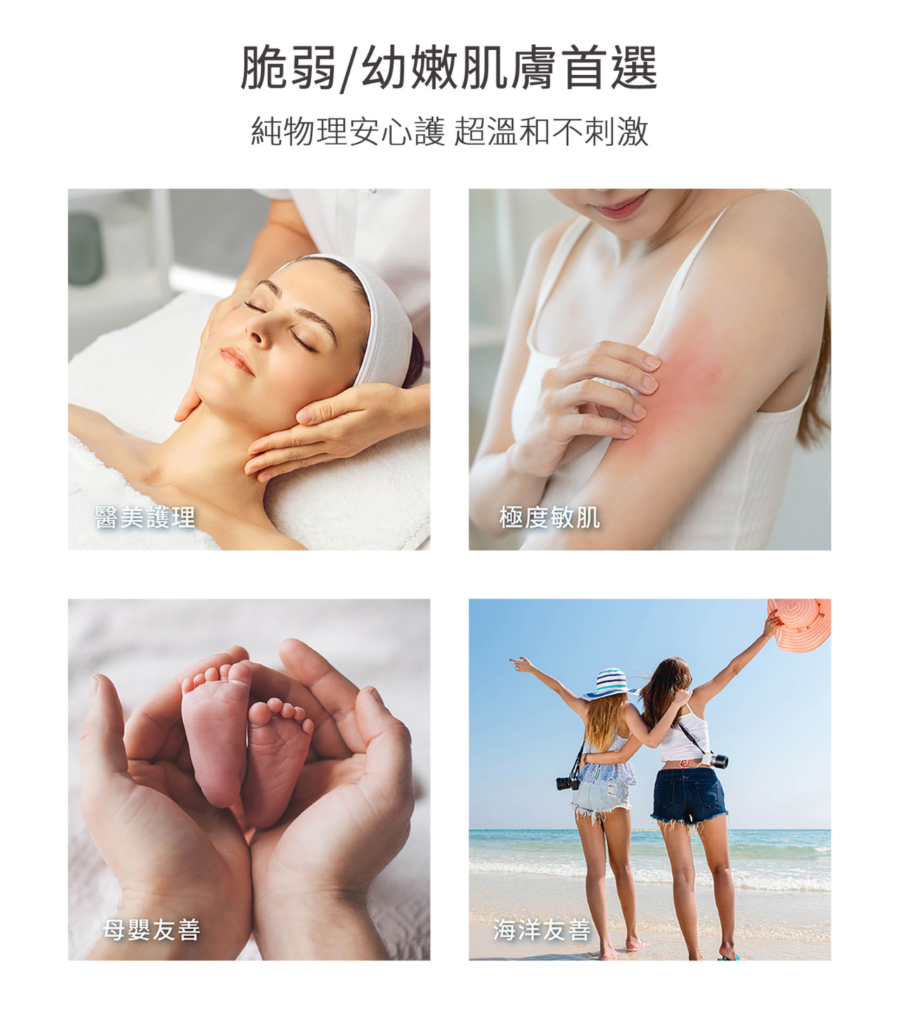 低敏物理防曬乳,獨特的100%純物理交聯折射機制,有效隔離UVA及UVB,預防曬黑及曬老,添加菸鹼醯胺(B3)、積雪草及復活草萃取,鎮靜修護肌膚,幫助減緩曝曬時的不適,實現外防禦、內修護的全方位防曬效果。純物理防曬配方,海洋友善,敏弱膚質及幼童適用。
