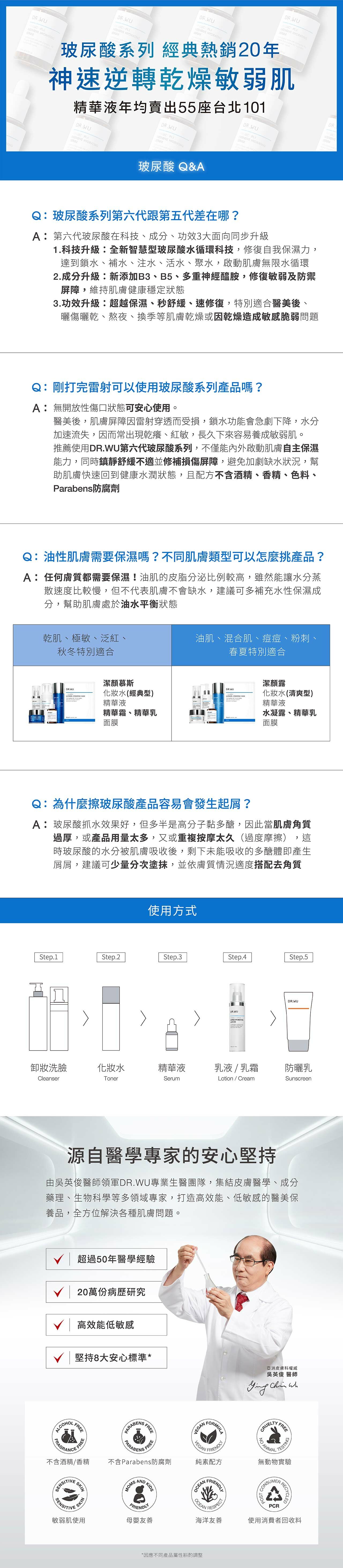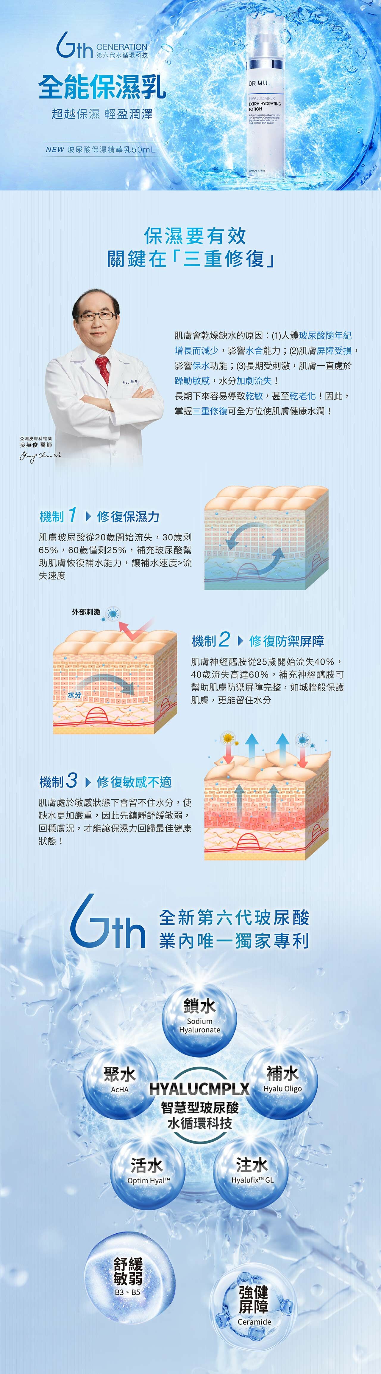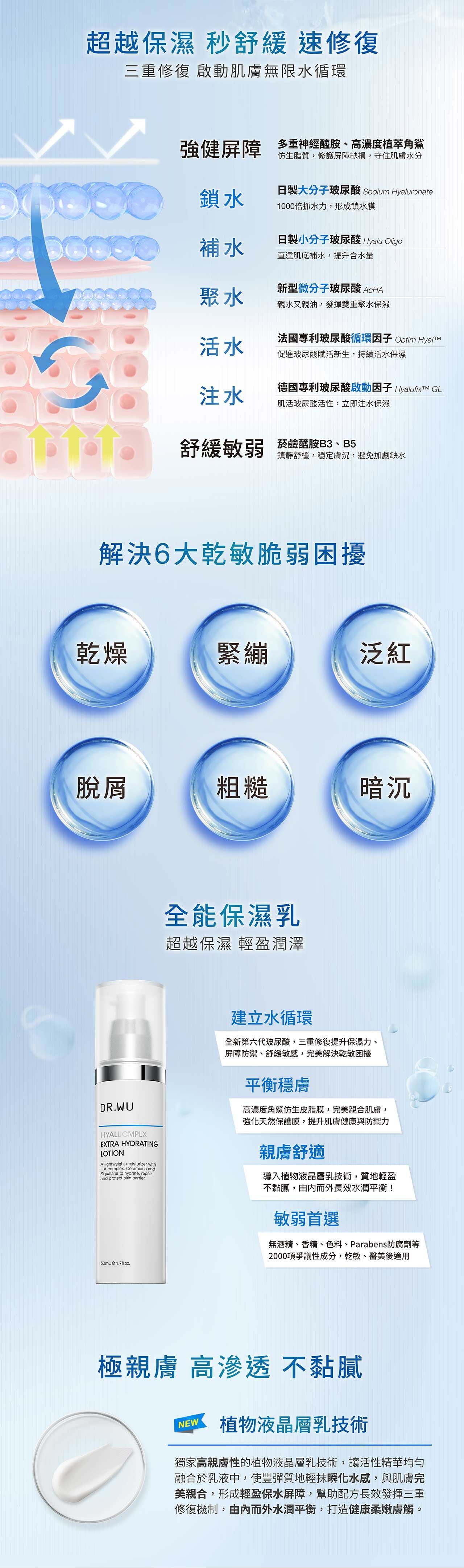 極致潤澤改善粗糙乾繃,使肌膚柔嫩散發健康水潤光澤。全新第六代「智慧型玻尿酸水循環科技」,結合日德法三國專利大、小分子玻尿酸並添加微分子玻尿酸,從源頭進行補水、鎖水、注水、活水、聚水循環打造源源不絕水分補給。結合B3、B5立即舒緩肌膚不適保濕力再升級,另添加三重神經醯胺和高濃度植萃角鯊快速修復肌表、提升屏障功能。保濕、舒緩、修復三重機制協同作用,瞬效改善乾燥、緊繃、泛紅、脫屑、粗糙、暗沉6大乾燥敏弱困擾。溫和不刺激,敏弱肌適用。