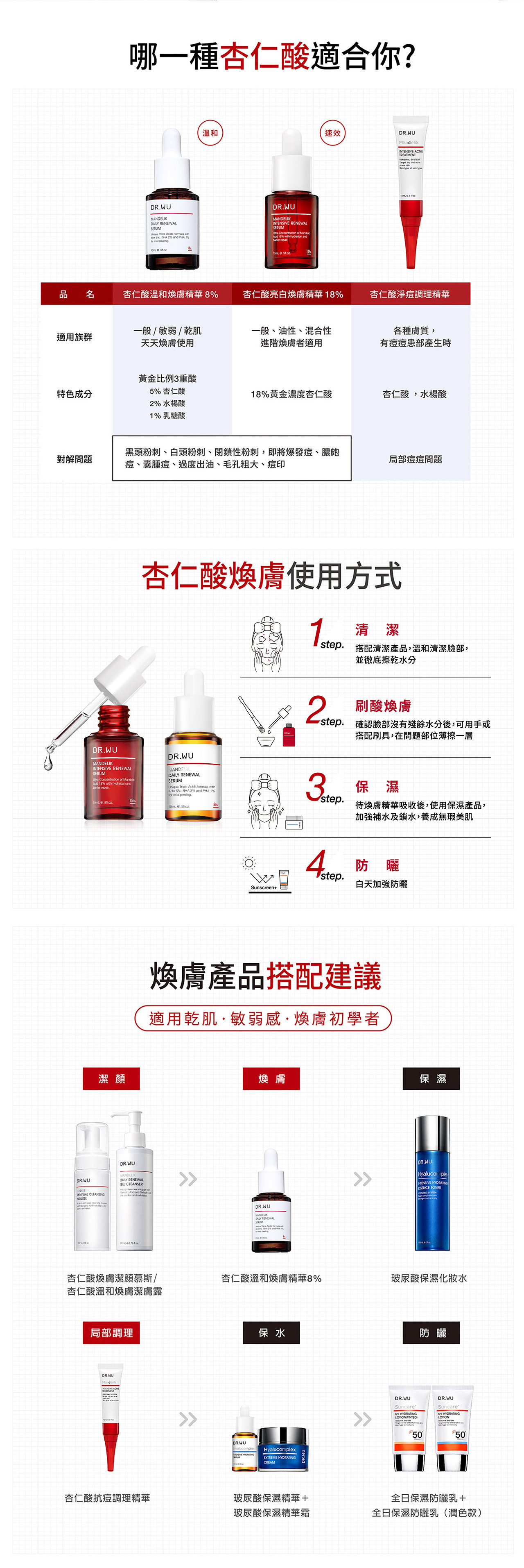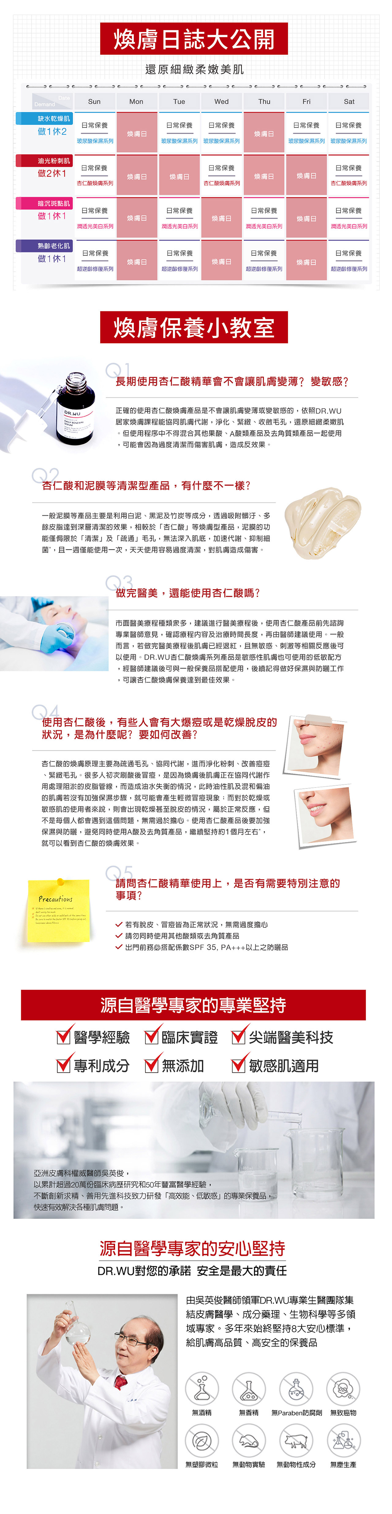 專為一般、乾肌、敏弱肌、天天煥膚者研發「黃金比例三重酸」,5%杏仁酸、2%水楊酸與1%乳糖酸,黃金比例5:2:1配方,既溫和又看的見煥膚效果,從根源改善毛孔粗大×黑白頭粉刺×痘痘x角質肥厚x痘印x出油x膚色不均x暗沉瑕疵等八大瑕疵問題。另添加添加複方沙漠植物萃取、鎖水磁石, 補水保濕緩解乾癢脫屑,溫和不刺激、不致敏,敏弱肌也能安心使用。