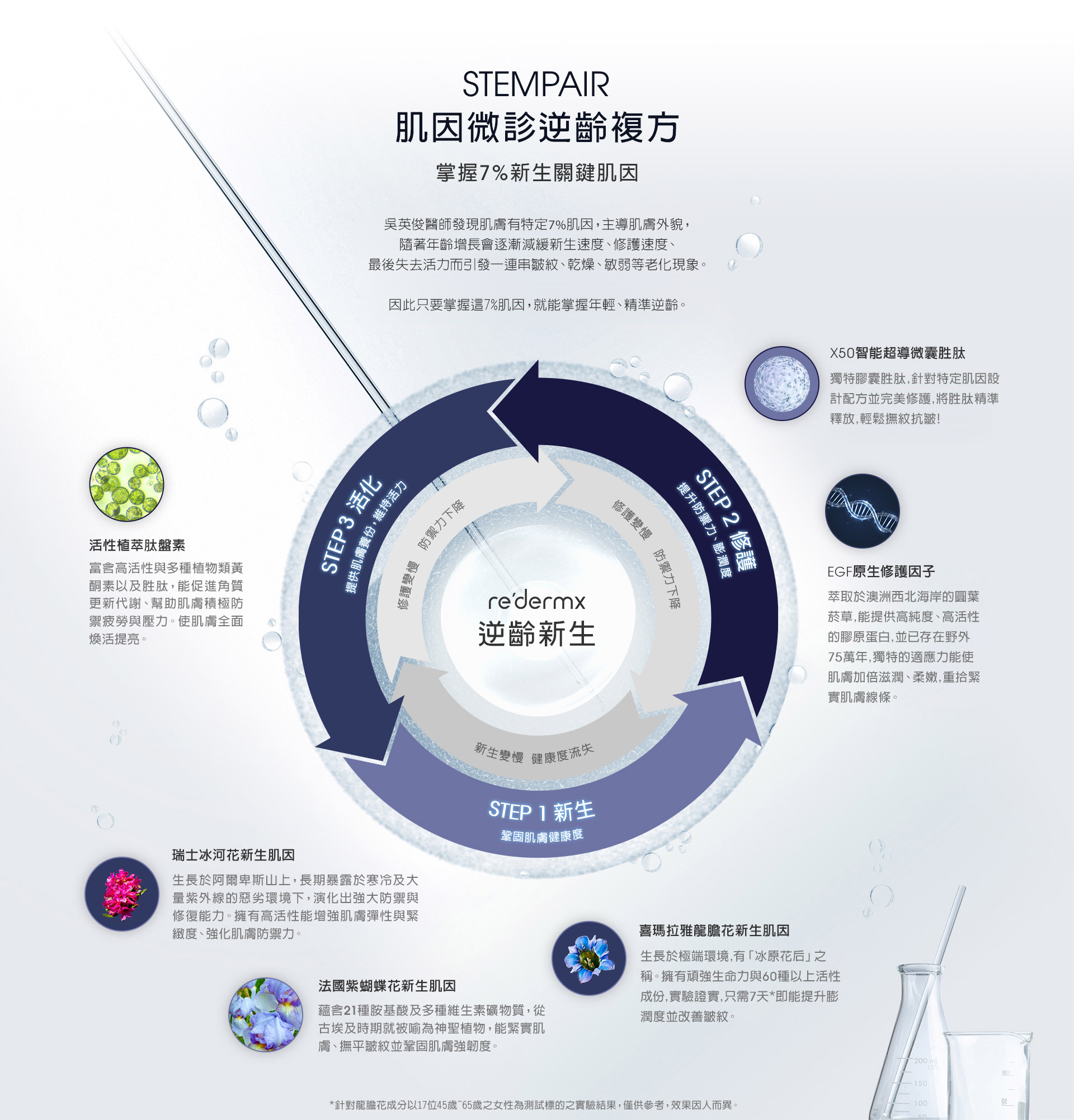 攜手瑞士生技團隊,針對7%關鍵肌因專研STEMPAIR肌因微診逆齡複方,能從根源一舉達成膨嫩、緊緻、明亮保養功效,打造充滿生命力的原生健康肌膚