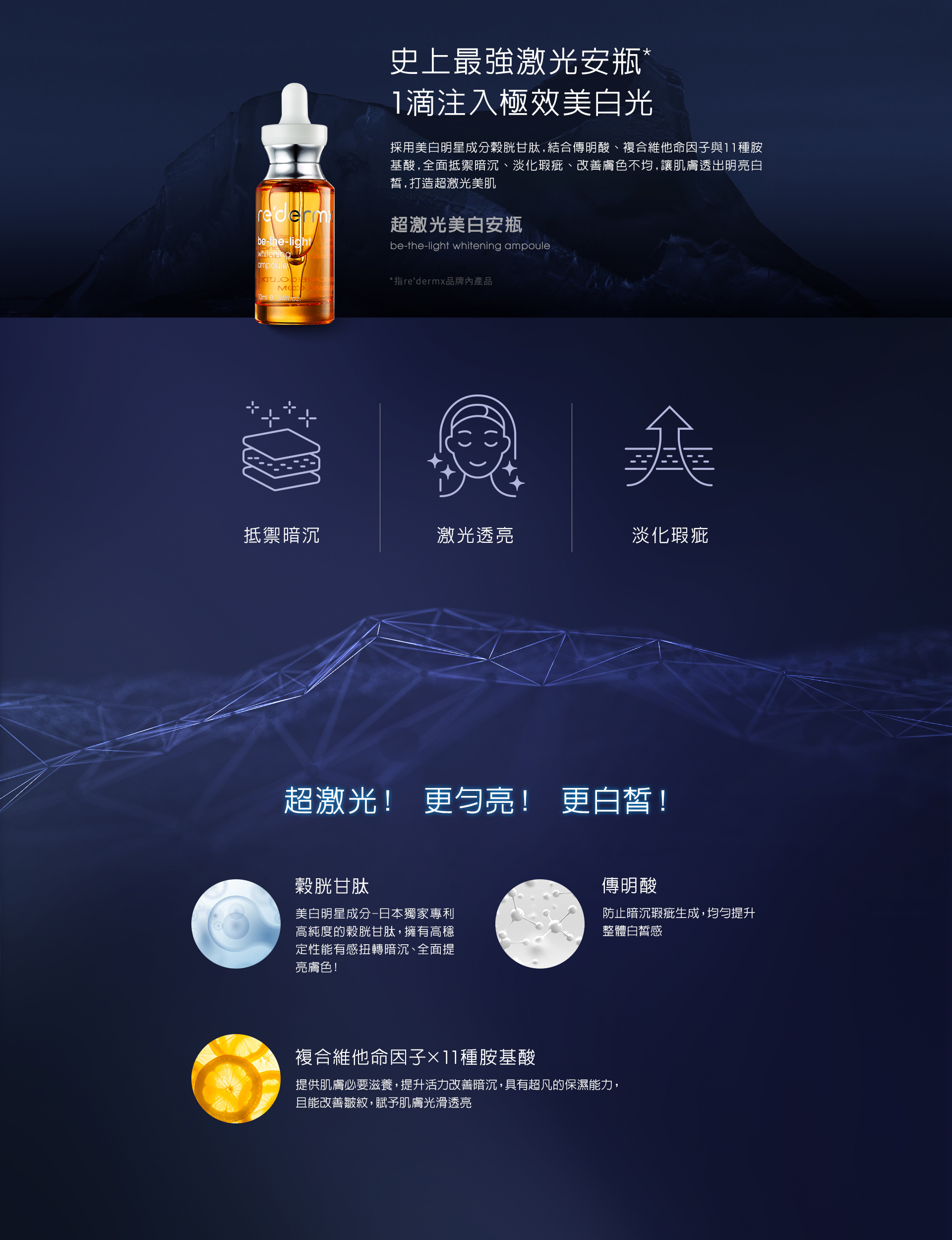 添加日本獨家專利高純度穀胱甘肽,擁有高穩定性能有感扭轉暗沉、全面提亮膚色
