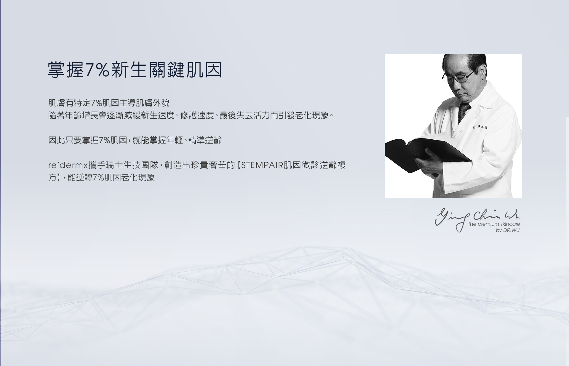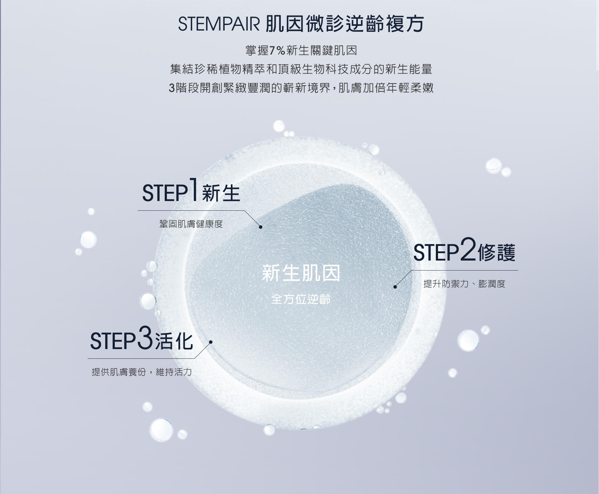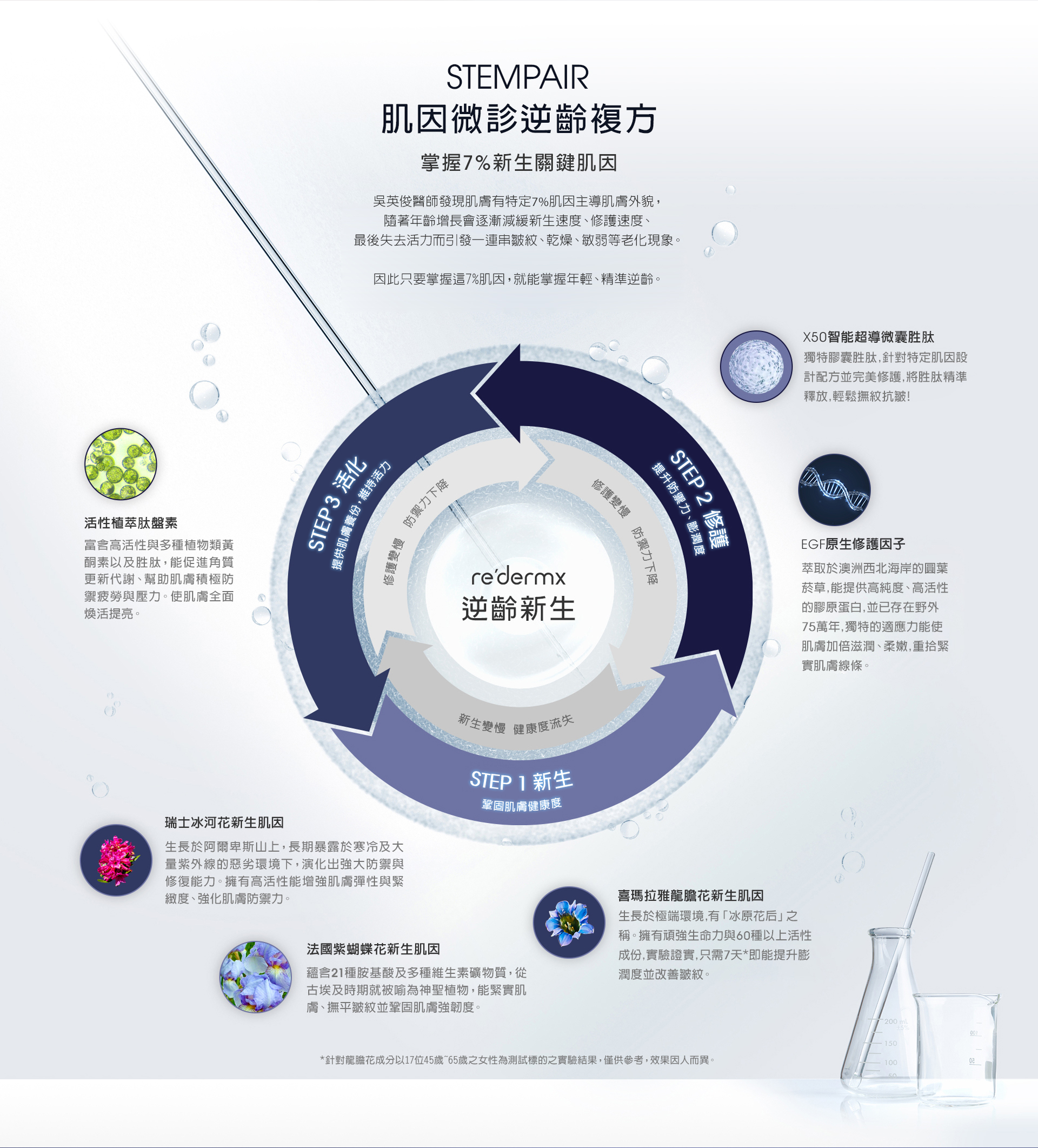攜手瑞士生技團隊,打造獨特STEMPAIR肌因微診逆齡複方,能掌握7%新生關鍵肌因,實現膨嫩、緊緻、明亮的原生健康肌膚