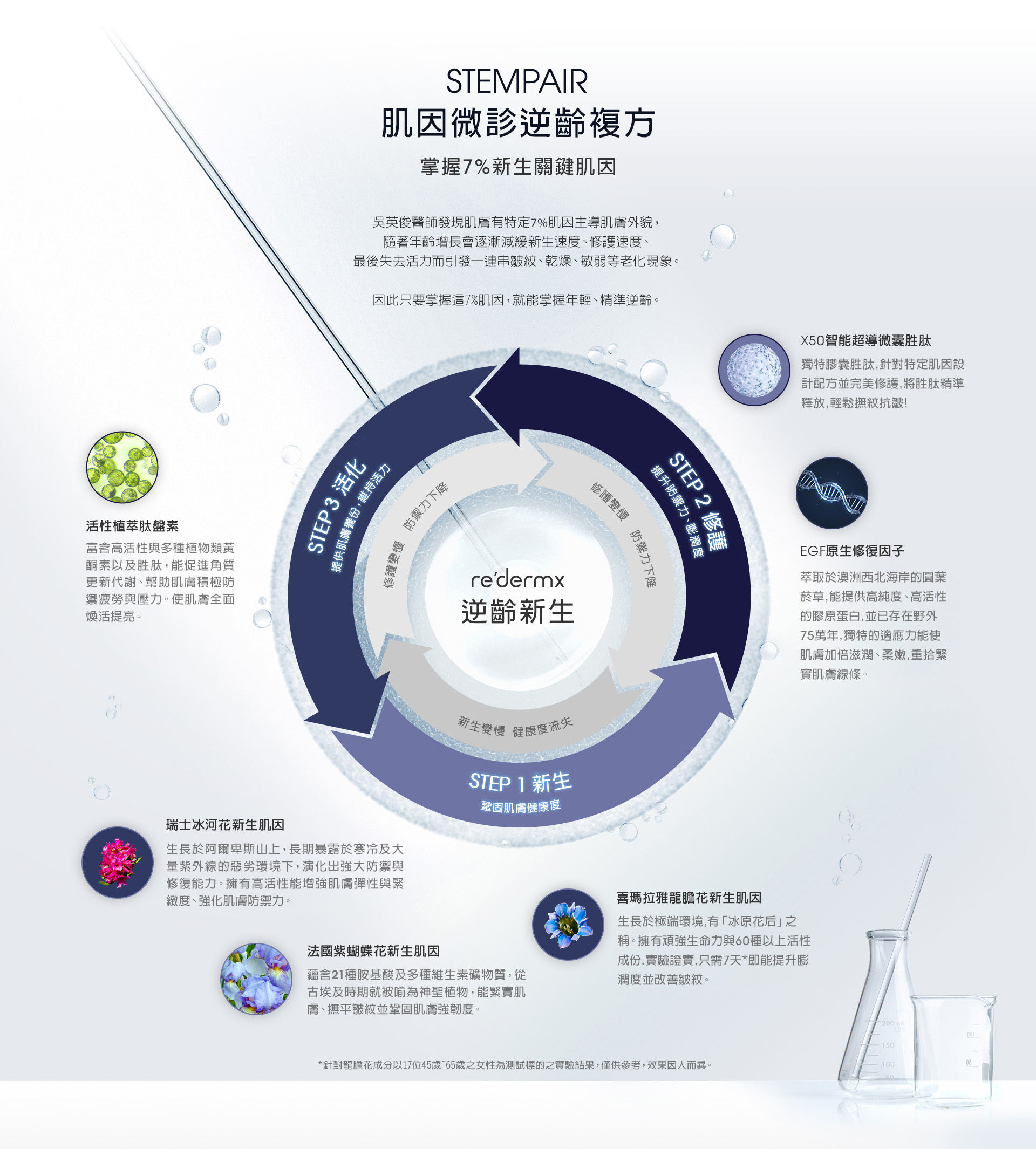 攜手瑞士生技團隊,針對7%關鍵肌因專研STEMPAIR肌因微診逆齡複方,能從根源一舉達成膨嫩、緊緻、明亮保養功效,打造充滿生命力的原生健康肌膚
