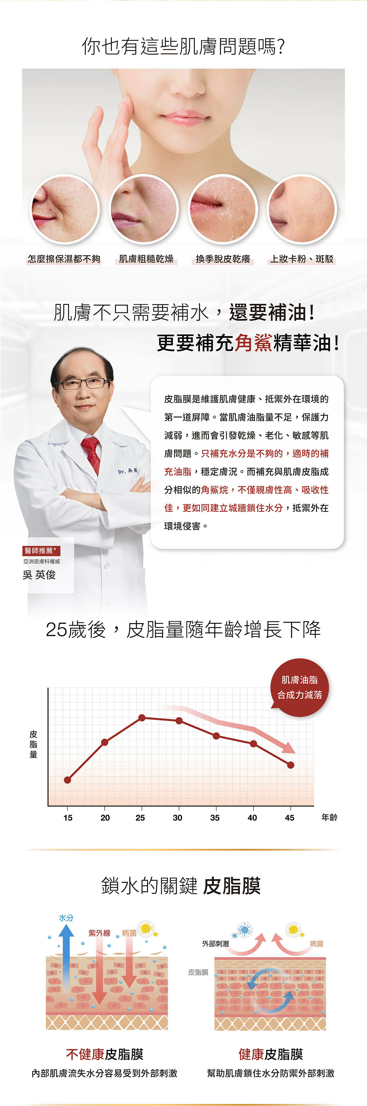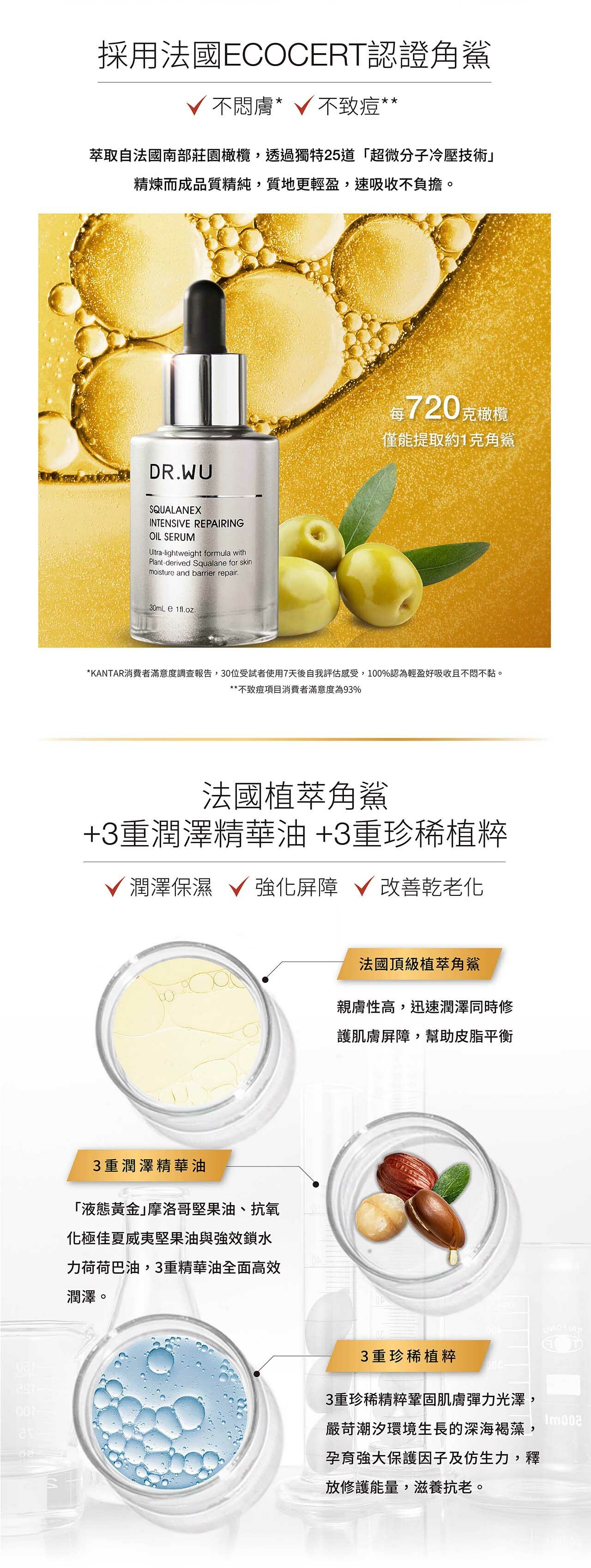 嚴選ECOCERT認證法國頂級植萃角鯊,萃取自法國南部莊園的橄欖,每720克橄欖,僅能提取約1克角鯊。透過25道「超微分子冷壓技術」成分更精純,仿造肌膚原生脂質的高規格打造高親膚、超輕盈質地,迅速滲透肌膚,不悶、不黏、不致痘。另添加3重珍奢精華油和3重植物精萃:液態黃金摩洛哥堅果油、夏威夷堅果油、鎖水力最強的荷荷巴油,和深海褐藻精粹 、白羽扇豆精粹、杜沙藻精粹,一滴即能將蘊含其中的頂級成分能量發揮至極,能全面修復肌膚屏障,立即改善乾繃、細紋、粗糙,重現柔嫩細緻光澤!