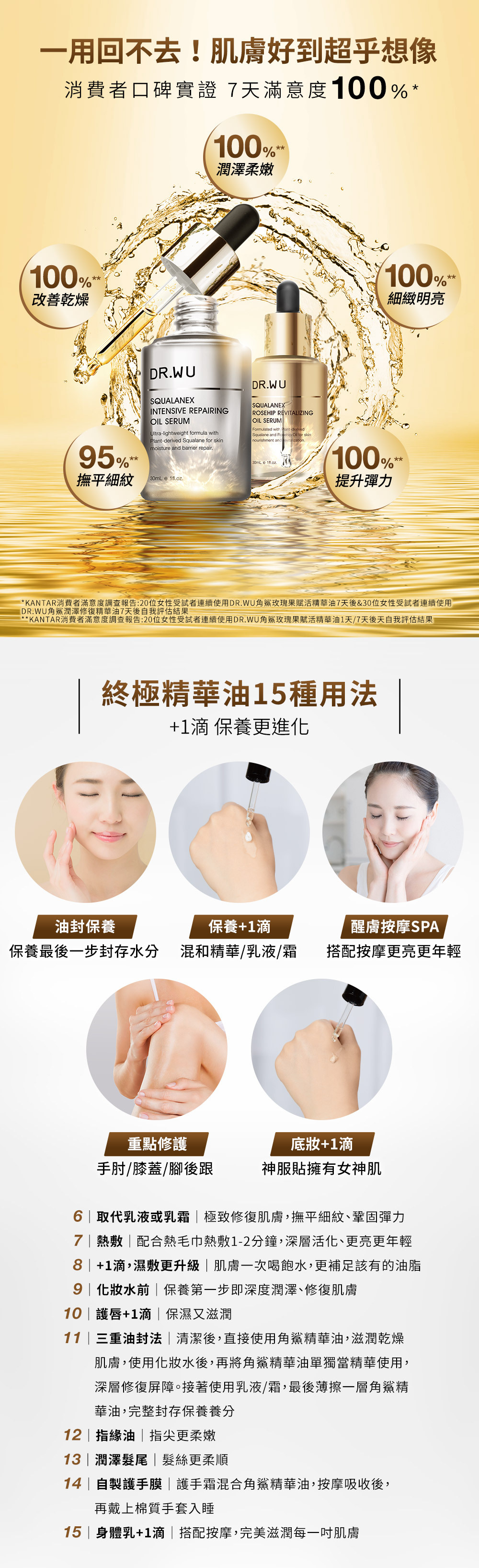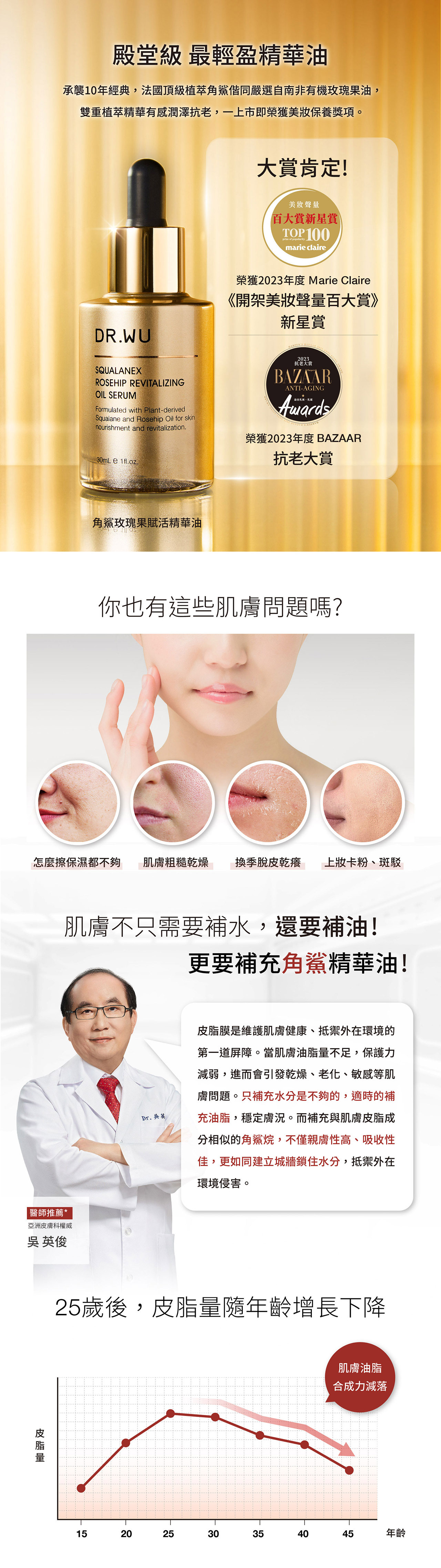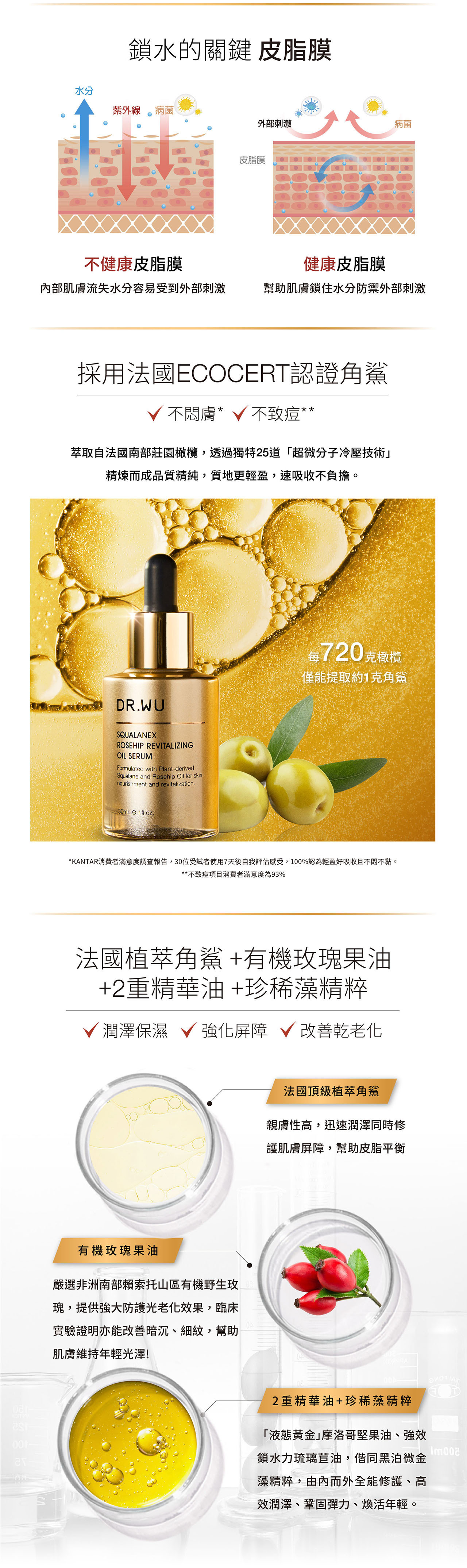 嚴選ECOCERT認證法國頂級植萃角鯊,萃取自法國南部莊園的橄欖,25度恆溫種植,手工親選,每720克橄欖,僅能提取約1克角鯊。透過25道「超微分子冷壓技術」,將油脂細緻化,使成分更精純,更以仿造肌膚原生脂質的高規格打造高親膚、超輕盈質地,能迅速滲透肌膚,不悶、不黏、不致痘。另添加3重珍奢精華油和1重珍稀藻精粹:源自南非山區的有機玫瑰果油,能深層滋潤、撫平細紋並提亮肌膚、液態黃金摩洛哥堅果油、英國有機琉璃苣油和法國黑泊微金藻精粹,僅僅一滴即能將蘊含其中的頂級成分能量發揮至極,能全面修復肌膚屏障,立即改善乾繃、細紋、粗糙,讓肌膚獲得全方位賦活與潤澤,重現柔嫩細緻光澤!