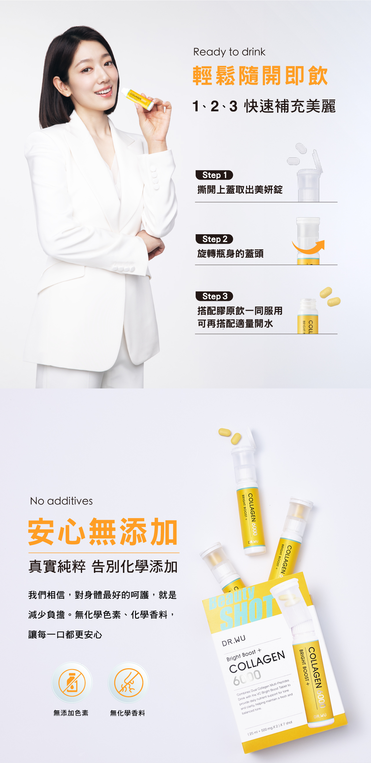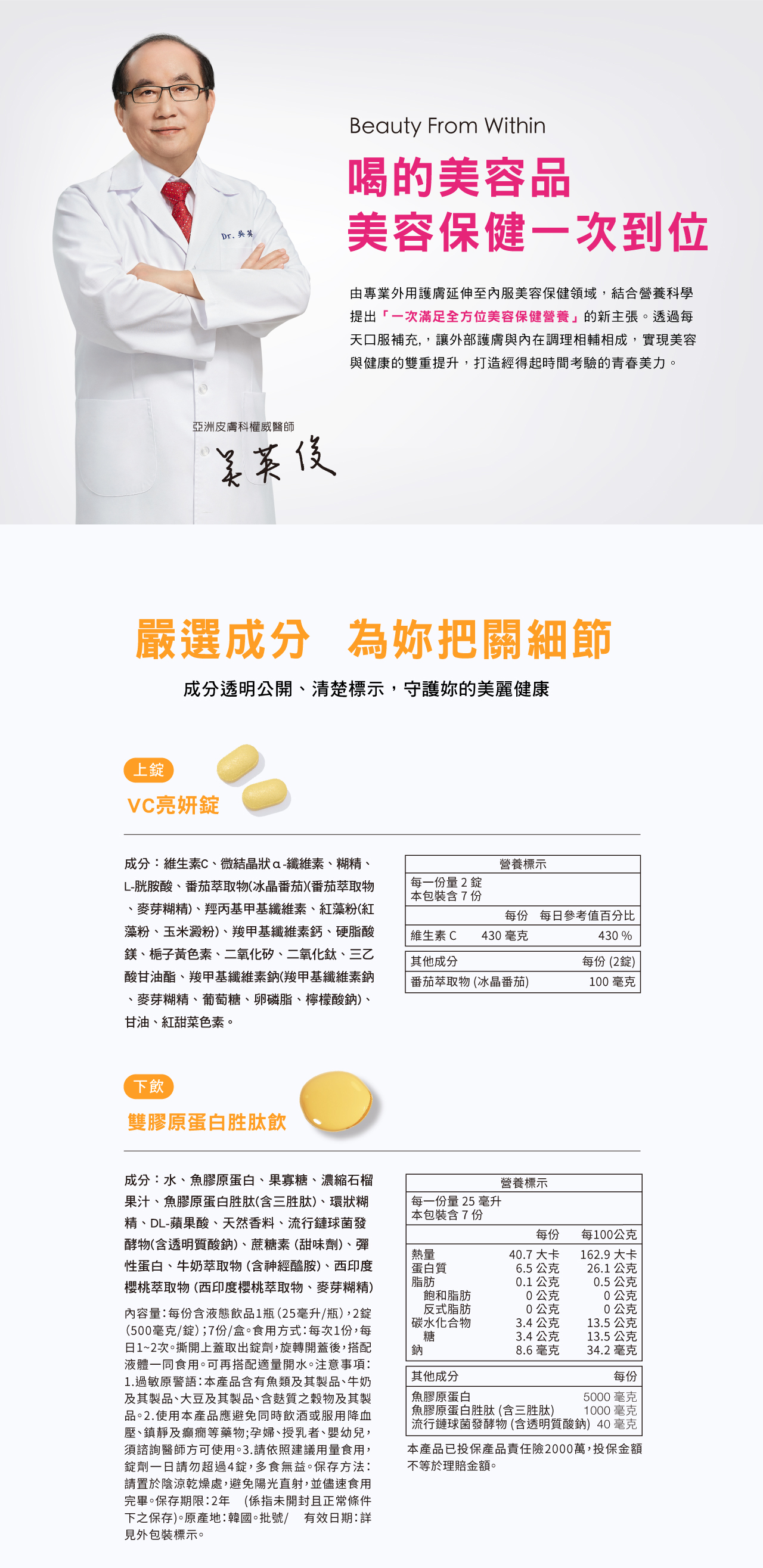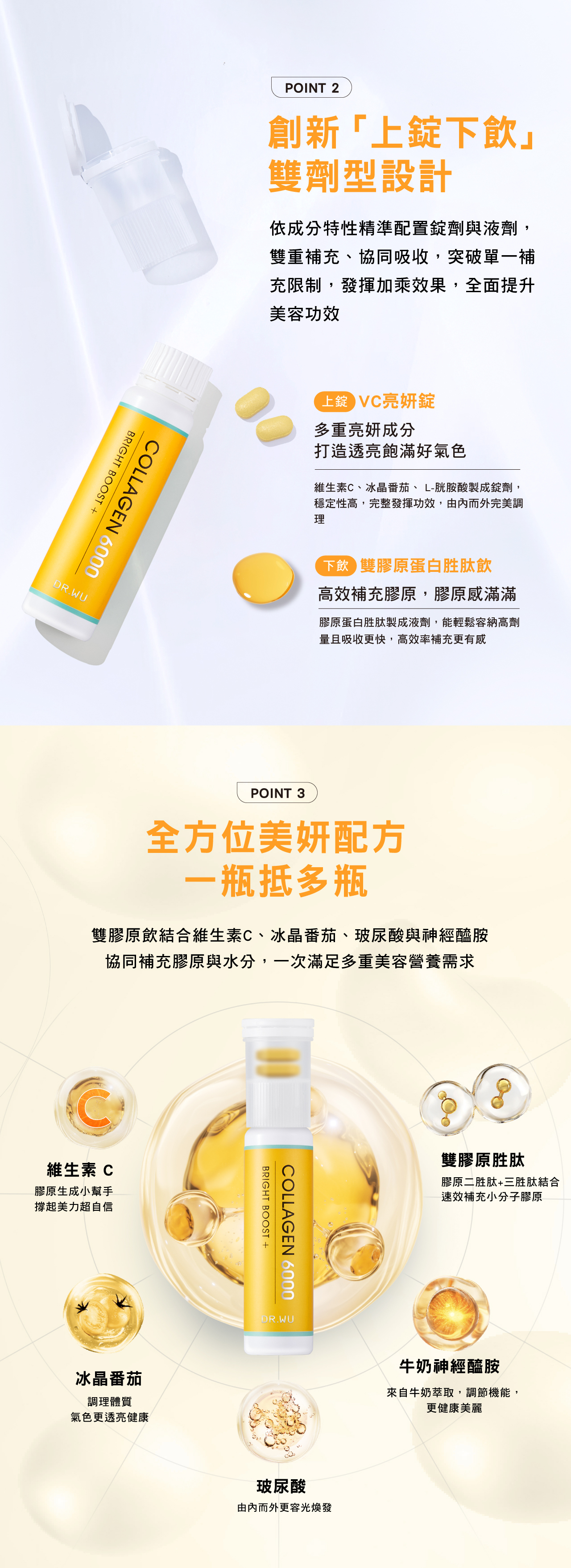 •創新「上錠下飲」,VC亮妍錠+膠原飲,1+1>2