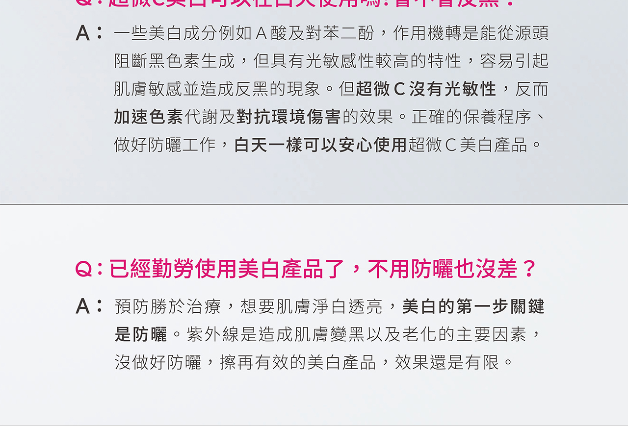 完美複合三種維他命C(乙基C、長效C、微脂C)並結合多種高濃度美白植物精萃所打造的美白革命科技超微C,全面啟動斷黑機制、勻亮膚色,再搭配菸鹼醯胺(B3)舒緩、以及角質分解因子Melaclear 2加速肌膚更新,輕盈水感質地易吸收,不留黏膩感,幫助改善暗沉、膚色不均等膚色困擾,為肌膚帶來細膩光澤,打造淨、透、勻、亮、白的鑽石般肌膚。溫和不刺激配方,敏弱肌也能安心美白,且無光敏問題,早晚皆可塗抹、全天候美白不打烊。