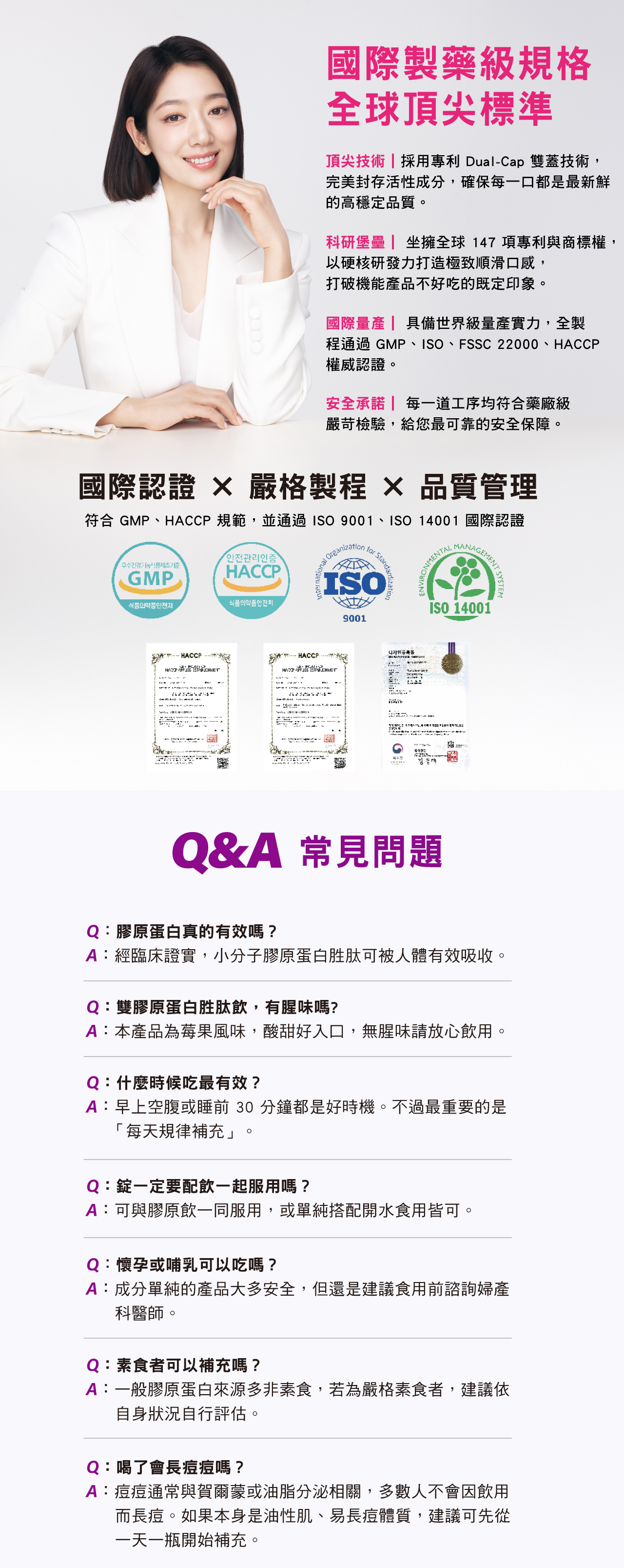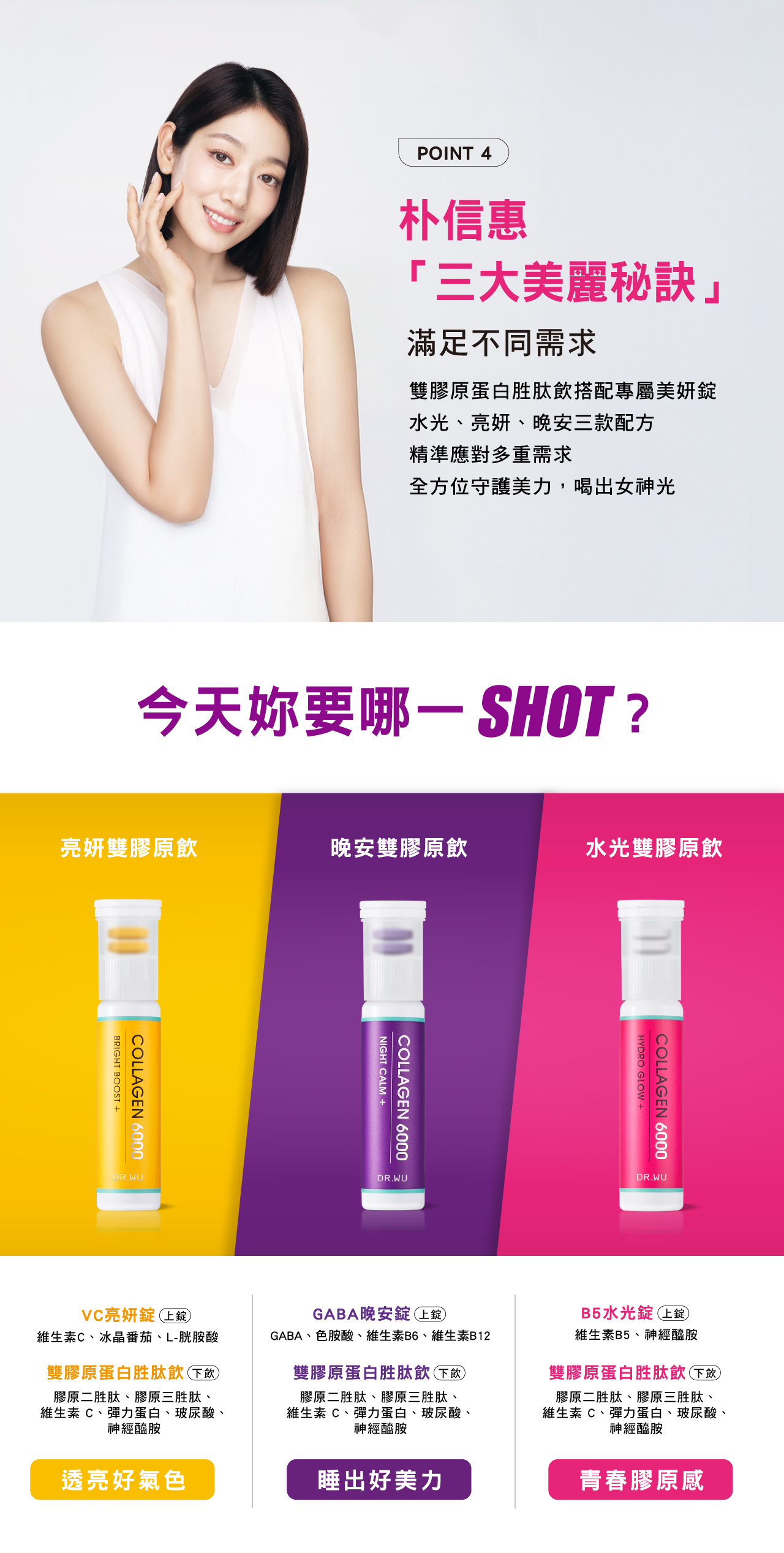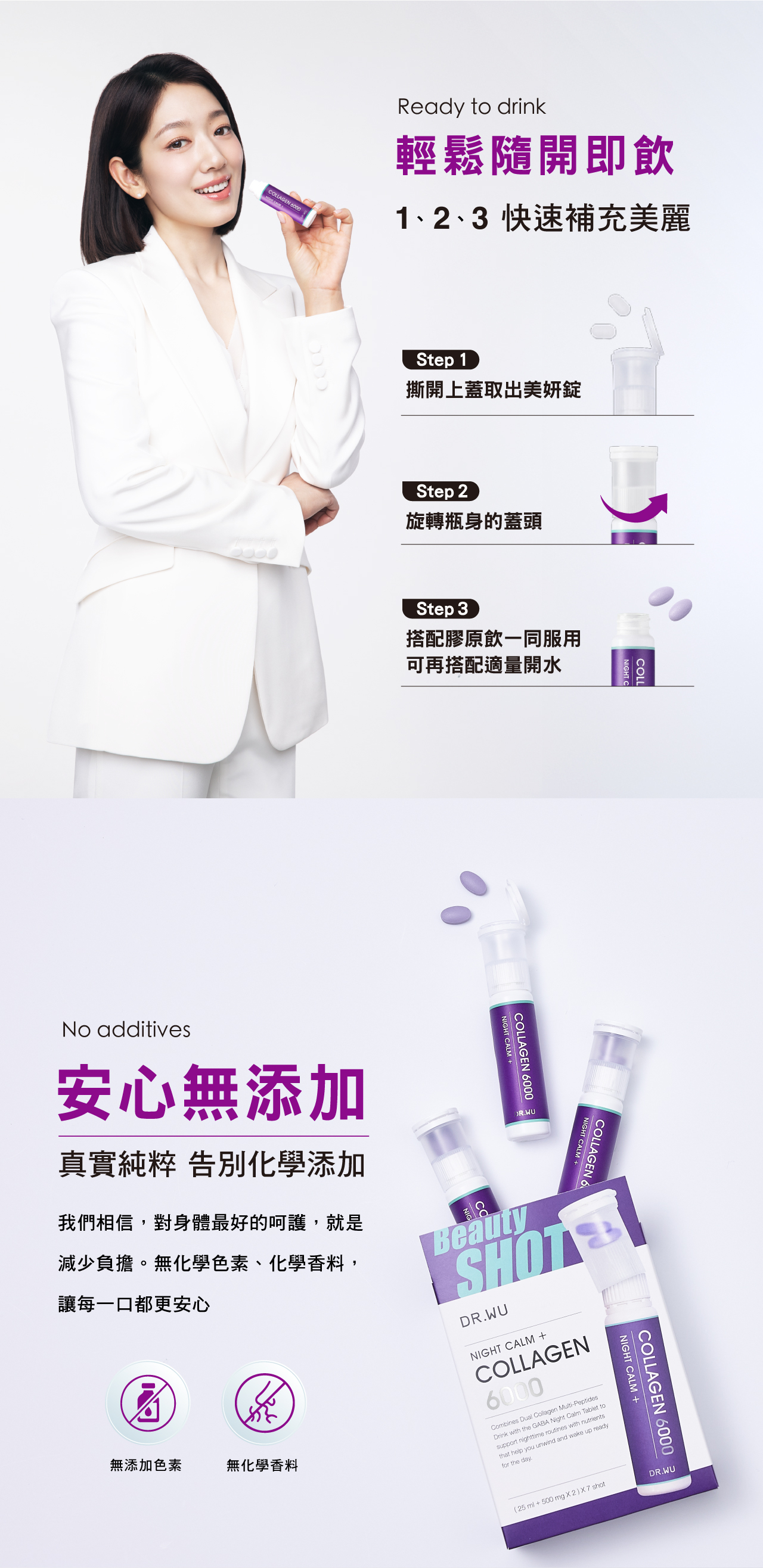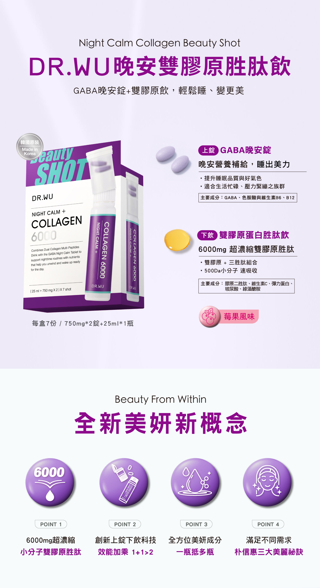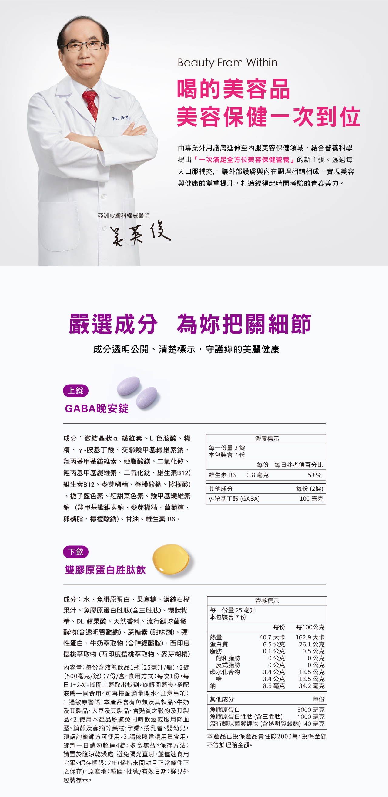 超濃縮小分子雙膠原胜肽,結合二胜肽與三胜肽,分子量低於500Da,美力更有感。GABA晚安錠含GABA、色胺酸與B6、B12,補充夜間營養,幫助入睡、容光煥發。全配方不含化學色素與香料,莓果無腥味,隨開即飲。適合生活忙碌、壓力大之族群提升睡眠品質