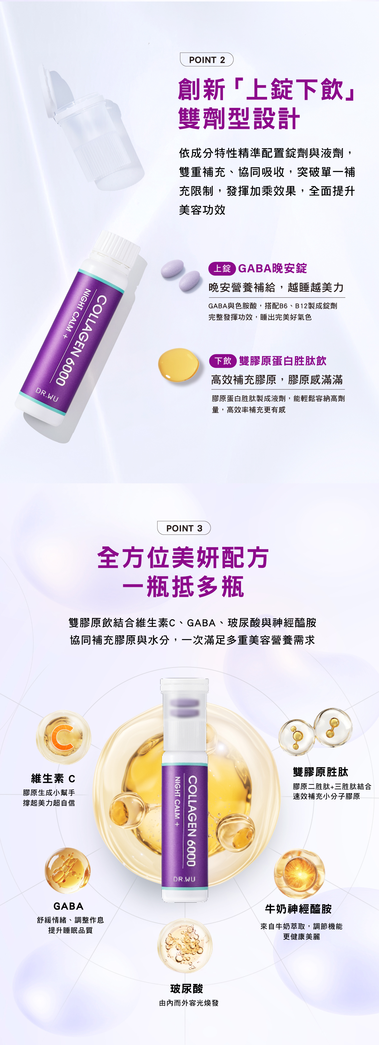 •創新「上錠下飲」,GABA晚安錠+膠原飲,1+1>2